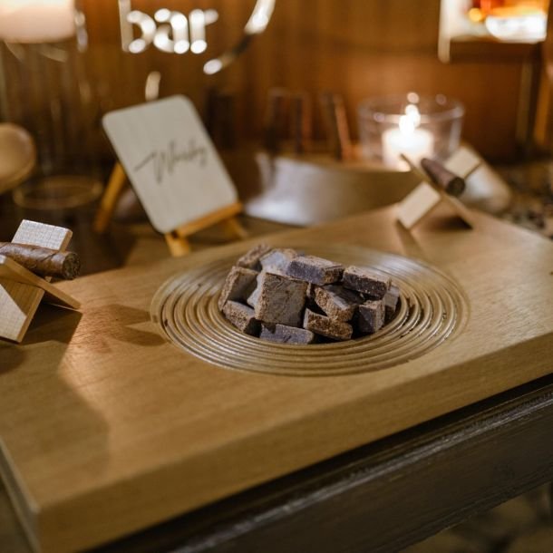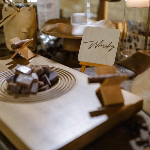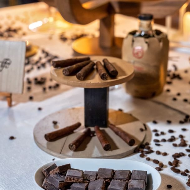 Arricchisci il tuo cigar lounge con la nostra selezione di cioccolato fondente artigianale, il perfetto complemento alla degustazione di sigari. Proponiamo tavolette di cioccolato extra dark e dolcezze selezionate che esaltano i sapori complessi del tabacco. L’abbinamento cioccolato-sigaro è una tradizione raffinata che aggiungiamo al nostro servizio tavolo sigari per matrimoni, eventi corporate e party esclusivi. Ogni dettaglio è curato per creare un’atmosfera elegante e sofisticata.